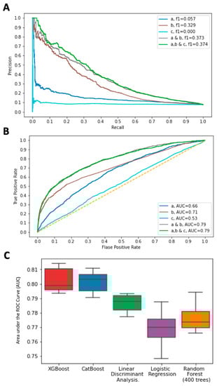 Performances of the prediction models for endometriosis. (A) Precision–recall curves for 5 CatBoost models. The models differ by training data with the UKB attributes and measurements (model a), the collection of the ICD-10 prior to endometriosis diagnosis age (model b), and the GWAS of endometriosis genetic variants (model c). A combination of training data of a and b and a combined model that includes a, b and c. (B) ROC curves for the same set of 5 models as in A. The diagonal line marks a random no-discrimination line (AUC = 0.5). (C) A comparison of the ROC-AUC of five different algorithms for the combined set of input features a, b, and c. XGBoost and CatBoost resulted in the highest performance according to ROC-AUCs.