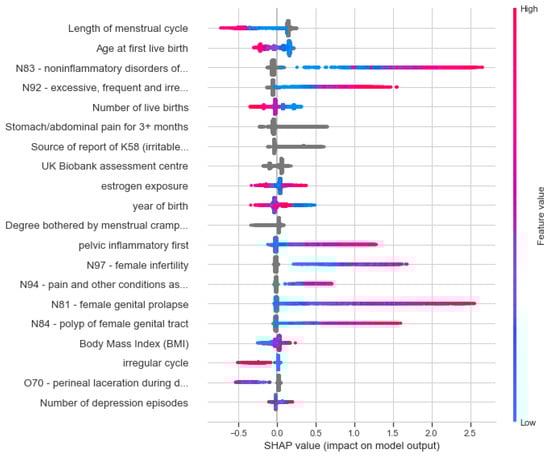 Top 20 features from the combined model using SHAP (an explainable AI tool). Variables are ranked in descending order of their SHAP value, where the most informative feature is at the top. The values reported show the contribution of each of the features according to the impact of that feature on the model outcome (i.e., endometriosis). Each dot in the plot represents a subject patient’s feature value for that variable (vertical axis). Color reflects the scale of the feature’s value. Color shows whether that variable is high (red) or low (blue) for that observation. Gray depicts no data or a categorical feature.