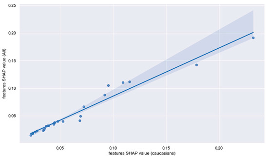 We compared the rank and the SHAP values of the models (a and b) using the population with mixed ethnicities relative to the Caucasian women’s cohort. Figure 7 shows the Pearson correlation for the top 20 features selected by their SHAP values in the two sets. While a few of the SHAP values deviated from the 95% confidence interval, the order of the selected features remained identical for the two tested sub-populations. Supplementary Table S7 lists the top 100 selected features along with their SHAP values for the Caucasian and mixed ethnicity populations.