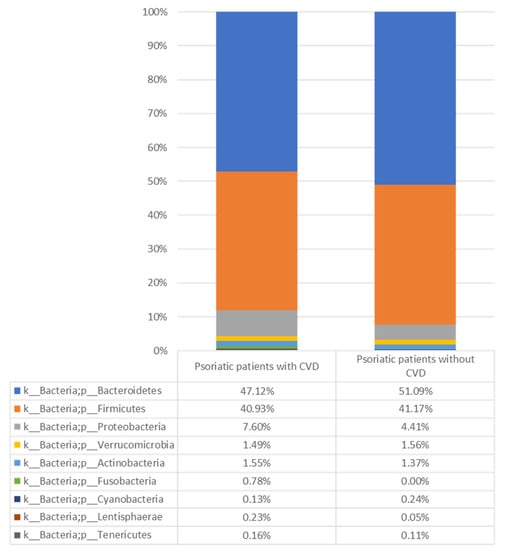 Relative abundance (%) of the gut microbes identified at phylum level in psoriatic patients with and without CVD. CVD: cardiovascular disease.