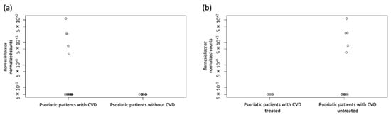 The abundance of the family Barnesiellaceae in psoriatic patients analyzed in this study. (a) Levels of the family Barnesiellaceae in the gut microbiome of psoriatic patients with and without CVD. (b) Levels of the family Barnesiellaceae in the gut microbiome of psoriatic patients with CVD treated and untreated with biological therapy. Each circle in the figure represents a psoriatic patient. CVD: cardiovascular disease.