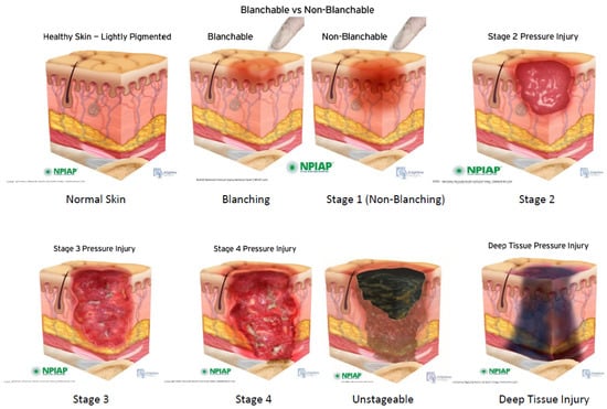 - Edsberg, L.E.; Black, J.M.; Goldberg, M.; McNichol, L.; Moore, L.; Sieggreen, M. Revised National Pressure Ulcer Advisory Panel Pressure Injury Staging System: Revised Pressure Injury Staging System. J. Wound Ostomy Cont. Nurs. 2016, 43, 585–597. [Google Scholar] [CrossRef] [Green Version]