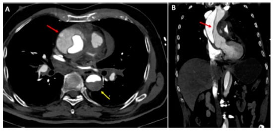 Type A aortic dissection: (A) Computed tomography axial view. Ascending aorta (red arrow) and descending aorta (yellow arrow) dissection; (B) dissection extending into the right subclavian artery (sagittal view). Reprinted/adapted with permission from Ref. [18]. Copyright year 2021, with permission from Elsevier.