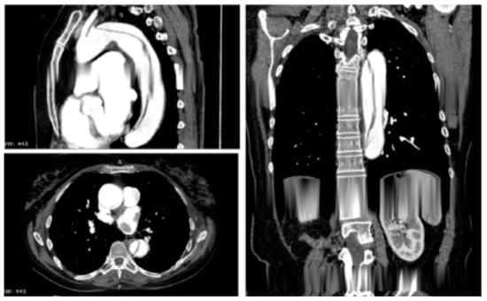 - Hiratzka, L.F.; Bakris, G.L.; Beckman, J.A.; Bersin, R.M.; Carr, V.F.; Casey, D.E.; Eagle, K.A.; Hermann, L.K.; Isselbacher, E.M.; Kazerooni, E.A.; et al. 2010 ACCF/AHA/AATS/ACR/ASA/SCA/SCAI/SIR/STS/SVM Guidelines for the Diagnosis and Management of Patients with Thoracic Aortic Disease. A Report of the American College of Cardiology Foundation/American Heart Association Task Force on Practice Guidelines, American Association for Thoracic Surgery, American College of Radiology, American Stroke Association, Society of Cardiovascular Anesthesiologists, Society for Cardiovascular Angiography and Interventions, Society of Interventional Radiology, Society of Thoracic Surgeons, and Society for Vascular Medicine. J. Am. Coll. Cardiol. 2010, 55, e27–e129. [Google Scholar] [CrossRef] [Green Version]