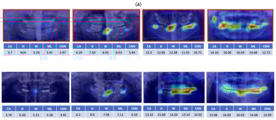 Interestingly, several features or rules have been once studied individually in previous studies. For example, the left-side dominant rule was used in the D and W method [,]. Additionally, the regions of interest located at the cervical and coronal portions of teeth have also raised several topics associated with age prediction. First, could the mineral density of the dental structures be an indicator of the growth condition? Amelogenesis is a multifactorial process, and enamel defects are frequently observed in many genetic and/or systemic disorders []. A previous case-control study reported the nonsignificant association between molar-incisor hypomineralization and the DA estimation []. Furthermore, another study also revealed a nonsignificant correlation between molar-incisor hypomineralization and short stature []. Therefore, it seems the mineral density of a tooth does not play a role in DA estimation. Secondly, the application of the linear pulp/tooth ratio as an indicator of age estimation has also been discussed [,,]. Although a negative correlation was found between the linear pulp/tooth ratio and age [], the reported error remained huge (<4 years) []. However, one recent CBCT study reported a strong correlation between the volumetric pulp/tooth ratio and the estimated age []. The detailed connection and interpretation of AI-extracted features would be of great interest in future studies.