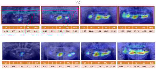 The feature identification of the convolutional neural network (CNN) models in samples. The comparison of the identified features by the CNN models between the healthy children and children with growth delay (GD) at the same age ((a) boys, (b) girls). The images of GD children are framed in red color. The coloring indicated the order of the increased intensity of attention from blue, green, yellow to red. The area and intensity of the feature identification in the GD children are relatively delayed compared to that of healthy ones. Abbreviations: chronological age (CA), D method (D), W method (W), machine learning (ML), convolutional neural network (CNN).