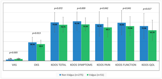 Mean (and SD) patient reported outcome scores in the valgus (green columns) versus non-valgus (blue columns) groups; (KOOS) Knee injury and Osteoarthritis Outcome Score; (OKS) Oxford Knee Score; (VAS) Visual Analog Scale; (QOL) Quality of Life.