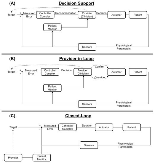 Flow diagrams describing physiological (A) Decision Support; (B) Provider-in-Loop; and (C) Closed-Loop controlled systems.