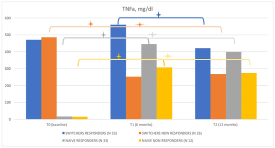 TNF-α levels in naïve patients and switcher responders and non-responders. The plus/star symbol (+) represent p-value = < 0.001.
