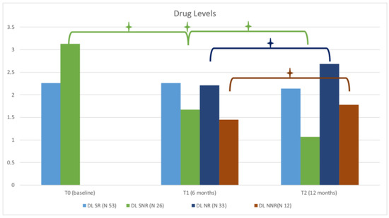 - DLs were higher in SNR at baseline (3.13 ± 0.2 mg/dL vs. 2.26 ± 0.11 mg/dL p < 0.0001) but became lower than SR value at 6 months (T1) (1.67 ± 0.16 mg/dL vs. 2.26 ± 0.1 mg/dL, p = 0.069) and at 12 months (T2) (1.07 ± 0.09 vs. 2.14 0.1 mg/dL, p < 0.0001), due to the decrease in DLs at follow-up in this cohort.