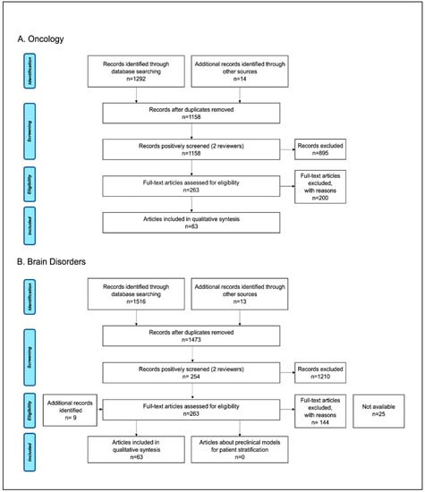 Study selection flow diagram: PRISMA flow-chart of data collection process for the (A) oncology and (B) brain disorders literature searches.