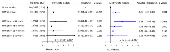 Univariate and multivariate Cox proportional hazards models of HTN onset age for incident AF. HTN was associated with increased risk of incident AF by approximately a factor of 2. In the univariate model, HTN onset at any age appeared to be associated with a higher risk of incident AF, while the risk of AF did not vary with the age of HTN onset. However, in the multivariate model, the risk of incident AF increased inversely with the age of HTN onset. * Mann–Kendell test. HTN, hypertension; HR, hazard ratio; CI, confidence interval; AF, atrial fibrillation.