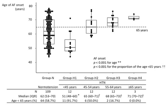 Age of AF onset in the different groups. * p < 0.05 vs. Group-N; † p < 0.05 vs. Group-H1. During the follow-up period, 148 participants developed AF. The age of AF onset ranged from 44 to 78 years, with a median of 63 years (IQR: 54–70 years). Among hypertensive participants, the age of AF onset was lowest in Group-H1 and highest in Group-H4. The age of AF onset in Group-N significantly differed only from that in Group-H1. Among hypertensive participants, the age of AF onset in Group-H1 was significantly lower than those in the other groups, and there were no significant differences in the age of AF onset among Group-H2-4. In Group-H1, the age of AF onset was <65 years in >90% of participants. ** Kruskal–Wallis test; †† Fisher’s exact test. HTN, hypertension; IQR, interquartile range; AF, atrial fibrillation.