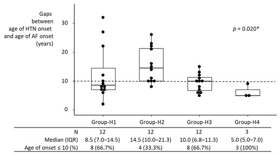 Interval between HTN onset and AF onset in hypertensive participants. AF developed in 39 of 1470 participants who were diagnosed with HTN at baseline. The interval between HTN onset and AF onset in Group-H1 was not significantly different from Groups-H2–H4 individually, nor from that in Groups-H2–H4 combined. If anything, it was shorter than in Group-H2, although this was not statistically significant (p = 0.099), possibly due to the small sample size. HTN, hypertension; IQR, interquartile range; AF, atrial fibrillation; * Kruskal–Wallis test.