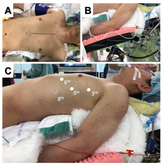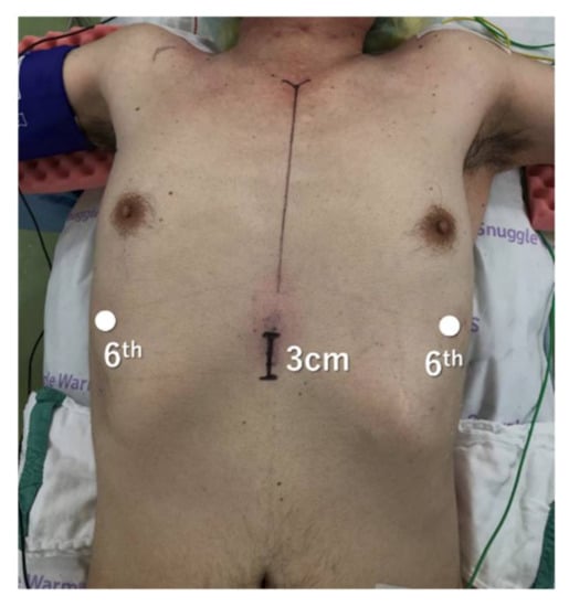 The lateral approach is usually performed via the right or left side; however, the bilateral approach may be used for extended thymectomy in patients with MG. Figure 1 shows the typical port placement for the three-arm lateral approach using the da Vinci Xi surgical system (Intuitive Surgical, Sunnyvale, CA, USA).