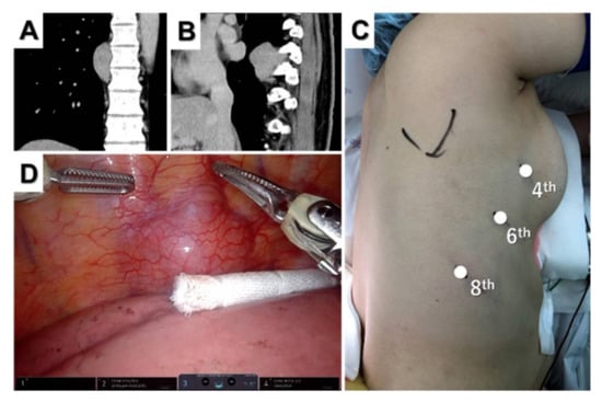 Most posterior mediastinal tumors are benign neurogenic tumors, such as schwannomas, neurofibromas, and ganglioneuromas. Patients are placed in the decubitus position [36] except when they have dumbbell tumors. Port placement depends on the tumor location. We used three robotic ports with linear port placement according to the position of the tumor. Figure 3 shows a patient with a right posterior mediastinal tumor at the Th8–9 level (Figure 3A,B).