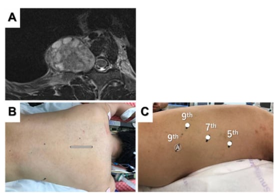 Magnetic resonance image showing a posterior mediastinal dumbbell tumor (A). The posterior incision (B) and port placement for robotic tumor resection (C) are shown.