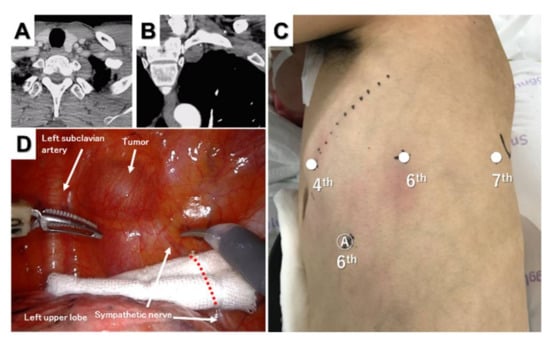 The camera port was inserted in the sixth intercostal space along the mid-axillary line, and CO2 insufflation was performed. Two additional trocars were inserted in the fourth intercostal space on the anterior axillary line and in the seventh intercostal space on the posterior axillary line (Figure 5C). An assistant port was placed in the sixth intercostal space on the anterior axillary line if necessary. The tumor was enucleated without electrocautery or bipolar cautery, and there were no perioperative complications, such as Horner’s syndrome or recurrent laryngeal nerve palsy.