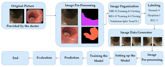 Esophageal cancer (EC) is an extremely dangerous and minimally researched cancer [1,2,3,4]. It is the eighth leading cause of cancer-related mortality and the sixth most common cancer type [5]. By the end of this decade, at least one in a hundred men in European countries such as the United Kingdom and the Netherlands will have EC [6]. Two out of five patients with EC are likely to be detected in late stages; hence, less than 20% of the patients survive more than 3 years [7,8,9]. Nevertheless, if the disease is diagnosed in the early stages, then the five-year survival rate will reach more than 90%. On the contrary, the rate will decrease to less than 10% when the disease is detected in the later stages. Thus, early detection of EC is important for increasing the survival rate [10,11]. At present, endoscopists are unable to draw a conclusion from the endoscope images of the esophagus during the early stages of EC [12]. Therefore, the disease can go unnoticed in the earlier stages. A precise assessment of individualized treatment depends on the accuracy of the initial diagnosis [13]. The endoscopic images acquired by using generic mechanisms will be altered by tissue secretion or instrument specifications, which may directly or indirectly lead to misjudgments in diagnosis. Computer-aided diagnosis (CAD) algorithms can be categorized based on the nature of the endoscopic image, either by narrowband image (NBI) or by white light imaging (WLI). These techniques use the penetration attributes of light. WLI utilizes a broad range of visible light to characterize the mucosa. Conversely, for NBI, two filters are placed on top of the light source, in the middle wavelength range: blue (415 nm) and green (540 nm) [14]. The infiltration of the blue filter is smaller than long-wavelength light. Nonetheless, it corresponds to the absorption of hemoglobin, thereby enabling veins, capillaries, and other parts with a higher hemoglobin ratio to appear darker and generate an adequate amount of contrast to the enclosing mucosa that reflects light. The second wavelength (540 nm) light corresponds to the secondary hemoglobin absorption peak; thus, deeper mucosal and submucosal vessels are made evident by the 540 nm light and are displayed in cyan [15,16].