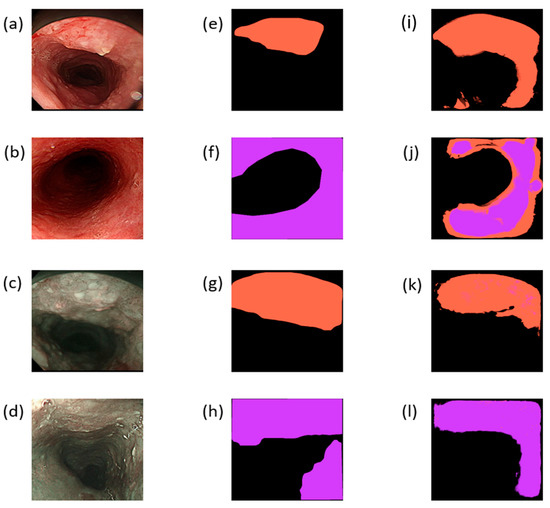 (a,b) Input images after cropping the original WLI images; (c,d) input images after cropping the original NBI images. (e–h) Ground-truth maps marked by doctors based on the corresponding input images. (i–l) Prediction results of the corresponding graphs; the orange mark corresponds to SCC, whereas the purple mark corresponds to dysplasia.