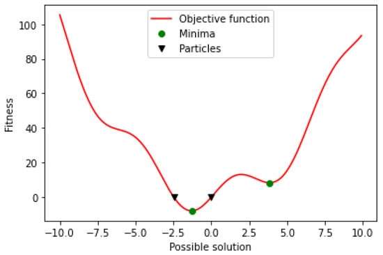 To begin using PSO, the problem domain must first be represented as a particle. Each particle in the swarm represents a potential solution. We assume that we want to find the best set of weights and biases for the MLP network depicted in Figure A1. The initial weights and biases in the MLP are initialized to small random values in the range [−1, 1]. The set of weights and biases can then be represented by a vector (particle), with a real number corresponding to each weight and bias. In total, there are 11 weight and bias parameters in the MLP shown in Figure A1, and thus the vector length is 11. If the swarm has a population of 100, then each generation (or iteration) contains 100 vectors, each of which is a potential MLP Network.