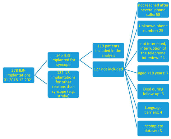After screening our clinical device implantation registry for implanted loop recorders between January 2018 and December 2021, we identified 378 patients that were possibly suitable for study inclusion. In total, 119 patients were reached out to for a telephone interview and agreed to participate in the study. For detailed information about the patient selection process, please see Figure 1.