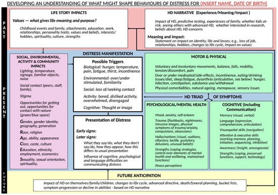 Other distressing behaviours (the term “challenging behaviours”, although arguably more common, has not been adopted in this article due to its blaming connotations) may be observed as the disease progresses, which translate into significant difficulties for families or carers to manage. These may include aggression, screaming, repetitive actions or phrases, destructive or dangerous behaviours, removing clothes in public or other disinhibited behaviours [19]. While these are traditionally viewed as a function of neurological changes in pwHD, more psychologically informed frameworks have begun to conceptualise how psychological distress, unmet needs and social context may coalesce with cognitive and organic changes to lead to expressions of distress through behaviour [20,21].