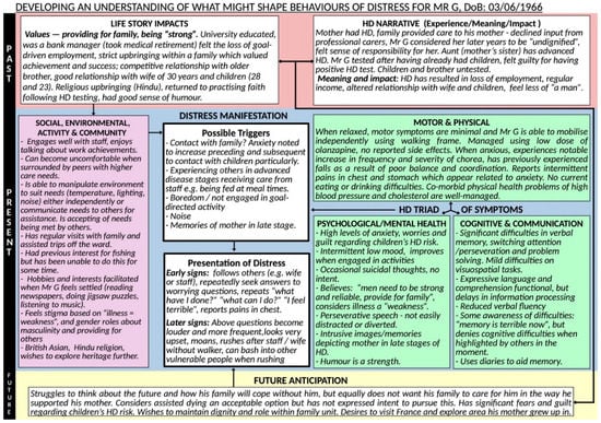 The “Present” components of the model aim to reflect an individual’s current experiences, taking into account both their internal and external world in the here-and-now. An individual’s distress presentation summarises the salient psychological issues. This could be behaviour that is experienced as challenging by others (e.g., care staff or family members), but it could also be internal experiences self-reported by the pwHD. Distress and possible unmet needs are considered in light of the pwHD’s current HD symptoms, environment, social contact, opportunity for activity and community understandings.