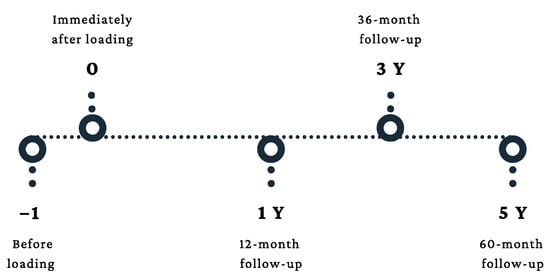 In this retrospective cohort study, the study cohort was obtained from patients who had at least one dental implant at the Shuang-Ho Hospital, Taipei Medical University, Taiwan. The properties of this cohort have been previously published [18] and therefore will be elucidated briefly here. The study protocol was authorized by the Joint Institutional Review Board of Taipei Medical University (approval no. N202103105). Opposing structures were arranged into two groups: natural tooth and dental prostheses, which included the implant tooth and fixed and removable partial prostheses. Moreover, all implant-related parameters were documented before loading (baseline), immediately after loading (after loading = prosthetic delivery), and 1 year, 3 years, and 5 years after prosthetic loading (Figure 1).