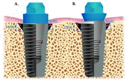 Radiographic measurements of the platform-switched and platform-matched dental implants. (A) Platform-matched dental implants (PM). (B) Platform-switched dental implants (PS). vMBL, vertical marginal bone level; hMBL, horizontal marginal bone level.