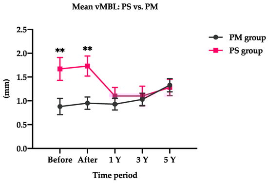Comparison of mean vMBL between the PS and PM groups. PS, platform-switched dental implants; PM, platform-matched dental implants; vMBL, vertical marginal bone level. ** p < 0.01.