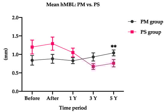 Comparison of the mean hMBL between the PS and PM groups. PS, platform-switched dental implants; PM, platform-matched dental implants; hMBL, horizontal marginal bone level. ** p < 0.01.