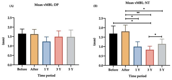Bar chart of the mean vMBL around PS dental implants opposing DP and NT. vMBL, vertical marginal bone level; DP, dental prostheses; NT, natural teeth; 1 Y, 1-year follow-up; 3 Y, 3-year follow-up; 5 Y, 5-year follow-up. * p < 0.05; ** p < 0.01. (A) Mean vMBL in the DP group; (B) mean vMBL in the NT group (before vs. 3-year loading, p = 0.023; after vs. 1-year loading, p = 0.011; after vs. 3-year loading, p = 0.003; after vs. 5-year loading, p = 0.029; 3-year vs. 5-year loading, p = 0.023).