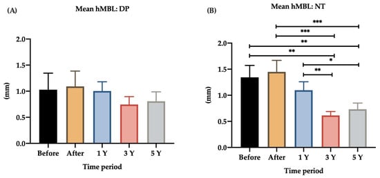 Bar chart of the mean hMBL around PS dental implants opposing DP and NT. hMBL, horizontal marginal bone level; DP, dental prostheses; NT, natural teeth; 1y, 1-year follow-up; 3y, 3-year follow-up; 5y, 5-year follow-up. * p < 0.05; ** p < 0.01; *** p < 0.001. (A) Mean hMBL in the DP group; (B) Mean hMBL in the NT group (before vs. 3-year loading, p = 0.002; before vs. 5-year loading, p = 0.002; after vs. 3-year loading, p < 0.001; after vs. 5-year loading, p < 0.001; 1-year vs. 3-year loading, p = 0.006; 1-year vs. 5-year loading, p = 0.023).