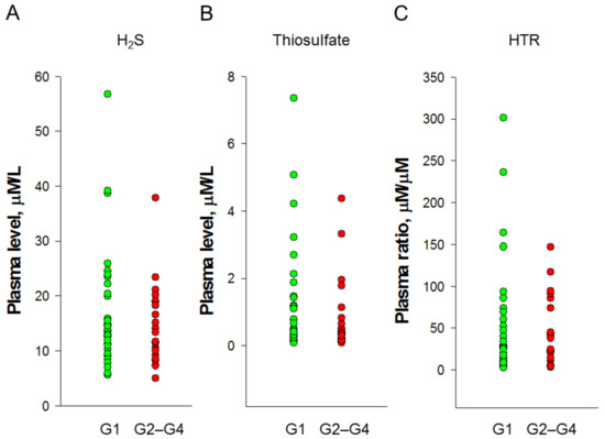 Plasma (A) H2S and (B) thiosulfate levels and (C) H2S-to-thiosulfate ratio (HTR) in CKD children.