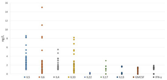 By Luminex assay, we detected high levels of IL-6 (3.1 ± 2.1 ng/L), IL-5 (2.8 ± 0.9 ng/L), IL-4 (1.9 ± 0.9 ng/L) and IL-33 (1.9 ± 0.9 ng/L). On the other hand, very low levels of IFN-γ (0.4 ± 0.2 ng/L), IL-13 (0.04 ± 0.2 ng/L), IL-17 (0.3 ± 0.2 ng/L), and GM-CSF (0.2 ± 0.2 ng/L) were noted. Nevertheless, all samples showed a detectable interleukin level that was within the sensitivity range provided by the manufacturer for each specific test. Figure 1 summarizes the levels of cytokines detected by the Luminex assay.