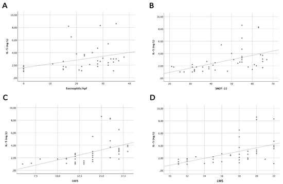 Correlation between IL-5 and main clinical parameters. Scatter plots reporting the results of Spearman’s rank test, with a significant linear correlation between IL-5 levels and eosinophilic count/HPF (A), SNOT-22 score (B), LKES score (C), LMS score (D). Abbreviations: hpf = high power field.