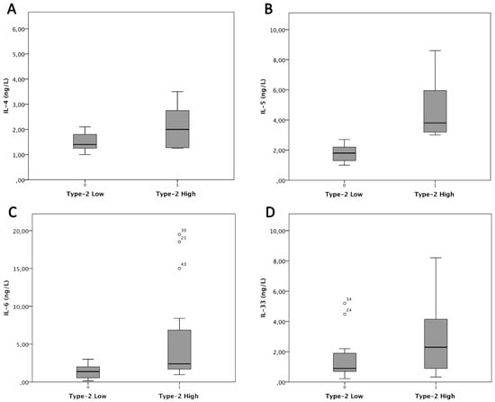 Cytokines’ levels based on inflammatory load. Box plots report the mean levels of the most representative cytokines according to the load of type 2 inflammation (high and low). Differences in mean levels of IL-4 (panel (A)), IL-5 (panel (B)), and IL-6 (panel (C)) were significant between the two subgroups, while IL-33 (panel (D)) showed a non-significant difference.