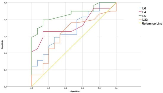 Statistical analysis was performed using SPSS 25 for Windows (IBM Corp. Released 2017. IBM SPSS Statistics for Windows, Version 25.0. IBM Corp: Armonk, NY, USA). Continuous values, such as levels of interleukins, symptom scores, endoscopic scores, and cell counts were expressed as mean ± standard deviation (SD). We performed a 2-step cluster analysis model with a maximum of seven ramifications that identified two main coherent clusters. Comparisons between measures of the two groups were performed with the Mann–Whitney U-test for non-normally distributed data and t-test for paired samples in normally distributed values. The Chi square test was used to compare categorical data such as prevalence and incidence. The strength of the correlation between the two parameters was obtained by Spearman’s rank correlation test. The results were considered significant for p values < 0.05. We performed receiver operator characteristic (ROC) curve analysis for IL-4, IL-5, IL-6, IL-33. The ROC curve is a regression model that estimates specificity and sensibility for every possible cut-off in the variable value range. Goodness of fit for different ROC curves can be compared using area under the curve (AUC) analysis for single coordinates of specificity and sensibility. Although AUC gives an estimate of general goodness of fit for the different models, the choice of the cut-off for the single model must be calibrated based on clinical purposes while balancing the need to minimize false negatives or positives.