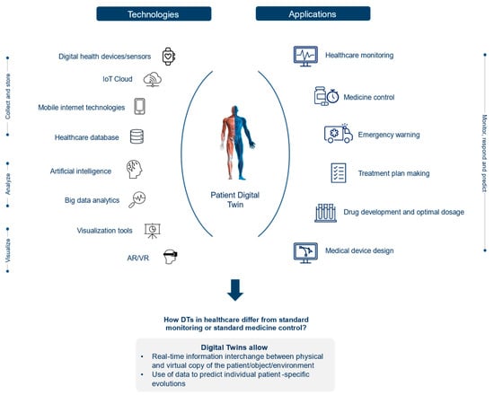DTs are realized using a diverse set of technologies, as shown in Figure 1: Digital health devices/sensors directly collect data from the patient and/or the environment, then transmit and store it in the IoT cloud in real-time. Big data analytics and AI extract meaningful information from an extensive amount of data and enable the visualization of a virtual twin of the patient at a different stage of the disease [9,14]. IoT, cloud computing, AI, simulation, visualization tools, and machine learning models are all necessary elements to build DTs. Advancements within these technologies and additional technological domains like virtual reality (VR) and supercomputers are making the use of DTs in healthcare increasingly attractive.