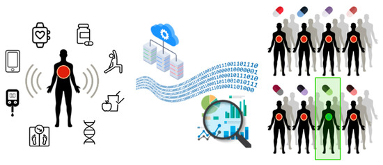 In summary, human DTs can benefit from the health sources where each living and non-living entity generate a massive digital footprint: (i) a formal healthcare system (e.g., electronic health records, lab test results, medical images, insurance, and pharmacy data); (ii) digital health devices (e.g., Bluetooth-connected glucose monitors, smart watches); (iii) patient surveys; (iv) real-world health data sources obtained from studies; (v) a variety of non-health and non-clinical sources reflecting lifestyle and habits (e.g., local weather, air quality level, buying habits, patient activity on social media); and (vi) hospital processes [6,12]. In particular, advancements in personal health monitoring devices in the form of mobile applications or built-in sensors can actively monitor a user’s vital health parameters such as ECG, BP, heart rate, and sugar level, which reduces the potential errors of data recording [13].