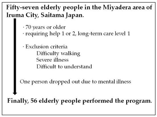 We conducted an observational study of 57 elderly people living in the Miyadera area of Iruma City, Saitama Japan. The inclusion criteria were used to select people aged 70 years or older who had assistance requirements of level 1 or 2, or long-term care requirements of level 1, according to the Long-Term Care Insurance Act in Japan. The long-term care service for elderly under the long-term care insurance system in Japan is divided into seven stages according to the content. Assistance requirements 1 is the mildest state of certification for long-term care and is close to independence in activities of daily living. Assistance requirements 2 is a state that requires a certain amount of social support, although it does not require long-term care. Long-term care 1 is a condition in which elderly people can do most of their personal tasks, such as preparing meals, on their own, but they partially need long-term care. The exclusion criteria for participation were as follows: I, elderly people who could not walk autonomously; II, elderly people with severe illness who had difficulty walking or may be better off; III, elderly people who had difficulty understanding the purpose of the research; and IV, elderly people who did not provide informed consent (Figure 1). The mean age of the subjects was 82.4 years old (82.4 ± 4.58 years old), and the male–female ratio was 15.8% for male subjects and 84.2% for female subjects. Although they did not initially fall under the exclusion criteria, one elderly person was excluded from the study because a serious mental disorder was identified, and we judged that the subject met exclusion criterion III.