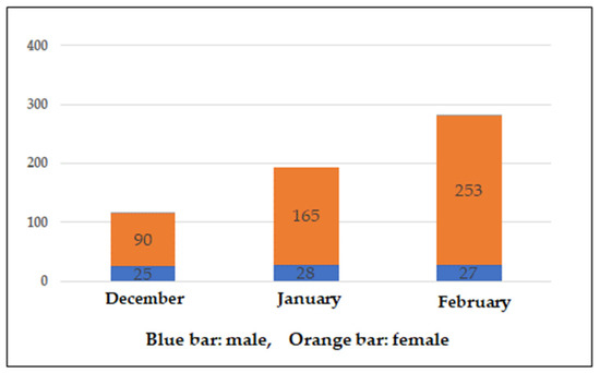 Number of monthly Choisoko reservations. Blue bar indicates male. Orange bar indicates female.