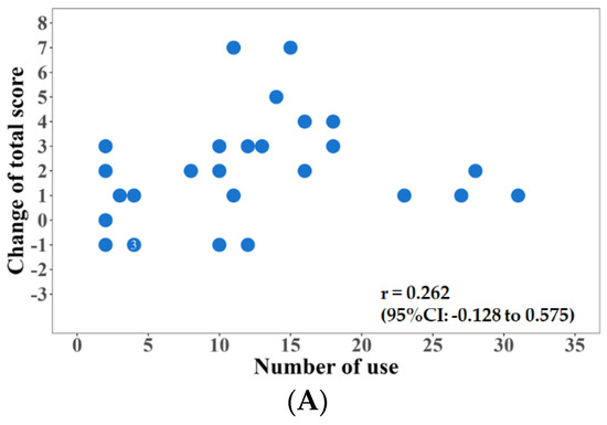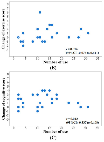 (A): relationship between the amount of change in the total FIM score and the number of times the choisoko is used. (B): the relationship between the amount of change in the FIM exercise score and the number of times the choisoko is used. (C): the relationship between the amount of change in the FIM cognitive score and the number of times the choisoko is used.