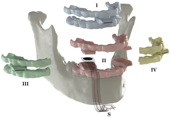 An overview of the used set-up including the bite sensor (S) and corresponding sets of upper and lower splints. The violet pair (I) of splints was used for incisal bite force measurements, the red pair (II) for bilateral premolar measurements, and the green (III) and yellow (IV) pairs for unilateral measurements of the right and left side of the premolars, respectively.