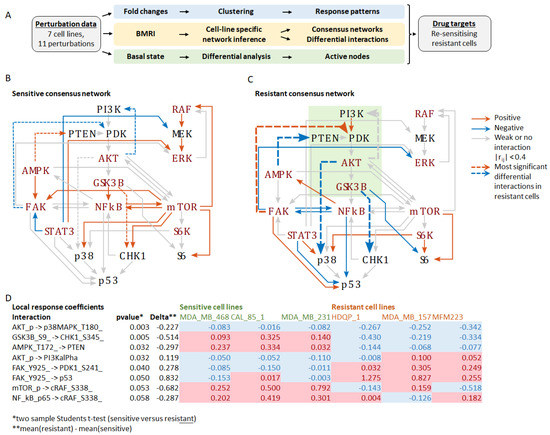 Network inference was performed for each cell line using the corresponding perturbation data by applying the BMRA algorithm described previously, and available as MATLAB code [12]. The prior network included all known canonical interactions (Supplementary Figure S2A), and interactions from all perturbed nodes to all other nodes with two exceptions: Raf-only phosphorylated MEK, and MEK-only phosphorylated ERK. BMRA relies on the assumption of signalling modules interconnected by information flow. Consequently, analytes that measure different phosphorylation on the same protein belong to the same module and were lumped into one node by averaging their measured values. The following nodes were lumped: AKT_S473_ and AKT_T308_ into pAKT; mTOR_s2481_ and mTOR_S2448_ into mTOR_p; S6RIB_S235_ and S6RIB_S240_ into S6RIB_p. The following 18 nodes were considered for BMRA network inference: cRAF_S338_, MEK1_2_S217_, MAPK_T202_, PI3KalPha, PTEN, PDK1_S241_, AKT_p, mTOR_p, GSK3B_S9_, AMPK_T172_, P70_S6K_T389_, S6RIB_p, NF_kB_p65, CHK1_S345_, p38MAPK_T180_, p53, stat3_y750_, FAK_Y925. BMRA was run using the following hyperparameters: number of iterations noit = 1000; burnin = 500; times = 10,000. The analysis was implemented in MATLAB R2019b and the code for the computational analysis is available in github: (https://github.com/dirkfey/TNBC-RPPA accessed on 15 February 2022).
