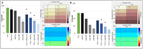 Growth inhibitory effect of cisplatin (μM) in combination with either (A) taselisib (PI3K inhibitor) (nM) or (B) ipatasertib (AKT inhibitor) (nM) in the MFM223 breast cancer cell line (TP53 Mutant/PIK3CA Mutant). Standard deviations are calculated from triplicate independent assays. Statistical analysis conducted using Prism, where a p-value of <0.05 was deemed statistically significant using a repeated measures ANOVA, which was corrected using Tukey’s multiple comparison test. Significant results are indicated with ‘*’. (A) Combifit analysis calculates the average % growth of either cisplatin or taselisib tested alone or in combination, whilst Loewe analysis calculates the synergy of the combination. (B) Combifit analysis calculates the average % growth of either cisplatin or ipatasertib tested alone or in combination, whilst Loewe analysis calculates the synergy of the combination cisplatin and ipatasertib tested alone or in combination.