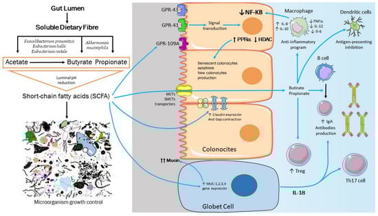 The downstream SCFA effects are mediated, at least in part, by histone deacetylase (HDAC) inhibition [42] downstream and thus decrease pro-inflammatory cytokine production. In addition, other essential functions of SCFA involve the peroxisome proliferator-activated receptor-alpha activation, increasing the substitution of old cells by renewed epithelial colonic cells [43] and the induction of IL-10 in T cells, as well as increasing the antibodies production through B cells differentiation into plasma cells [44] improving the adaptative immunity response [45]. In addition, factors such as SCFA speed, volume, and acetate/propionic/butyric ratio bring a complex interplay between fermentable diet polysaccharides, microbiome diversity and activity, and, eventually, the gut transit time.