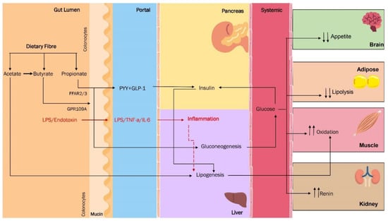 It is well-known that fermentable carbohydrate consumption and SCFA administration produce a wide range of health benefits, including body composition improvement, increased insulin sensitivity, a low-risk lipid profile, body weight reduction, and cancer risk reduction as colon cancer. In the same vein, SCFA also plays an essential role in obesity pathophysiology by intermediary metabolism regulation and appetite control [46], at least, in part, by stimulating the incretins synthesis and secretion by entero-endocrine L cells, a specific butyrate-mediated effect [47,48]. Thus, an interesting group of scientific papers conducted in humans by Chambers et al. [49] using soluble fiber as inulin propionate-ester demonstrated an appetite and food intake attenuating effect mediated by propionate. Other studies from the same group have found equivalent results regarding food choice [50], improving pancreatic function and modulation of liver lipid metabolism. Moreover, oral propionate administration increases fat oxidation in humans regarding energetic metabolism regulation. Finally, in experimental models, propionate reduces food intake via the gut–brain axis in animals [51]. This evidence highlights an SCFA-rich diet’s importance in managing obesity and associated diseases, including hypertension and other cardiovascular diseases. For instance, the butyrate induces renal prorenin receptors and renin expression, attenuating the angiotensin-II effects [52], and acetate and propionate regulate renin production via Olfr78 and a counter-regulation loop with FFAR3 [53] (Figure 2).