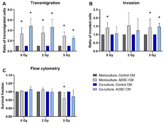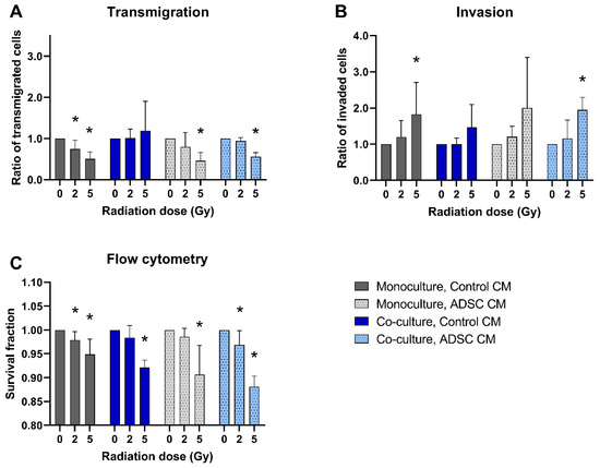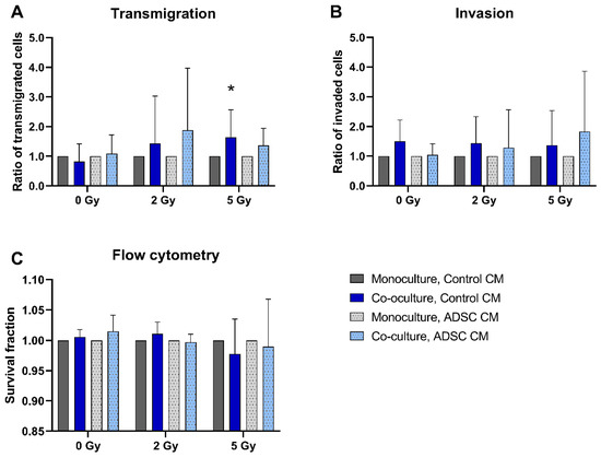 A total of 5 Gy irradiation inhibited the transmigration of MCF-10A cells in monocultures and in co-cultures treated with ADSC CM compared to non-irradiated cells (p = 0.037; Figure 3A). In contrast, the invasion of monocultured MCF-10A cells treated with control CM and of co-cultured MCF-10A cells treated with ADSC CM was significantly increased after irradiation with 5 Gy (p = 0.037; Figure 3B). Irradiation decreased the cell survival of MCF-10A cells significantly, whereby the surviving fraction was lower after irradiation with the higher irradiation dose (Figure 3C).